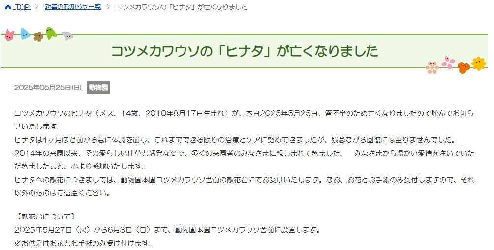 ニュース東山動植物園のコツメカワウソ「ヒナタ」(メス・14歳)が、2025年5月25日、腎不全のため亡くなったそうです