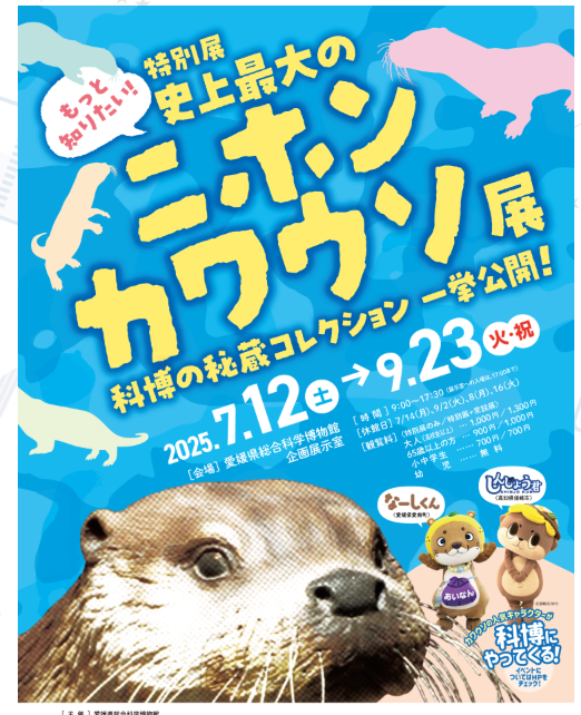「史上最大のニホンカワウソ展」が開催されています! ニュース 2025.09.15愛媛県総合科学博物館にて、「史上最大のニホンカワウソ展」が開催されています。ニホンカワウソの骨格標本など、秘蔵コレクションが展示されています。期間は2025年9月23日までです。
