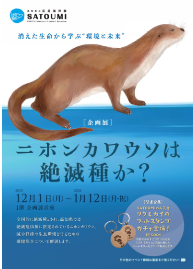 ニュース全国的に絶滅種とされ、高知県では絶滅危惧種に指定されているニホンカワウソ。減少経緯や生息環境を守るための環境保全について解説します。会場では関連グッズとして、当館で暮らすユーラシアカワウソの兄弟「リク」と「カイ」のフットスタンプガチャも登場します。