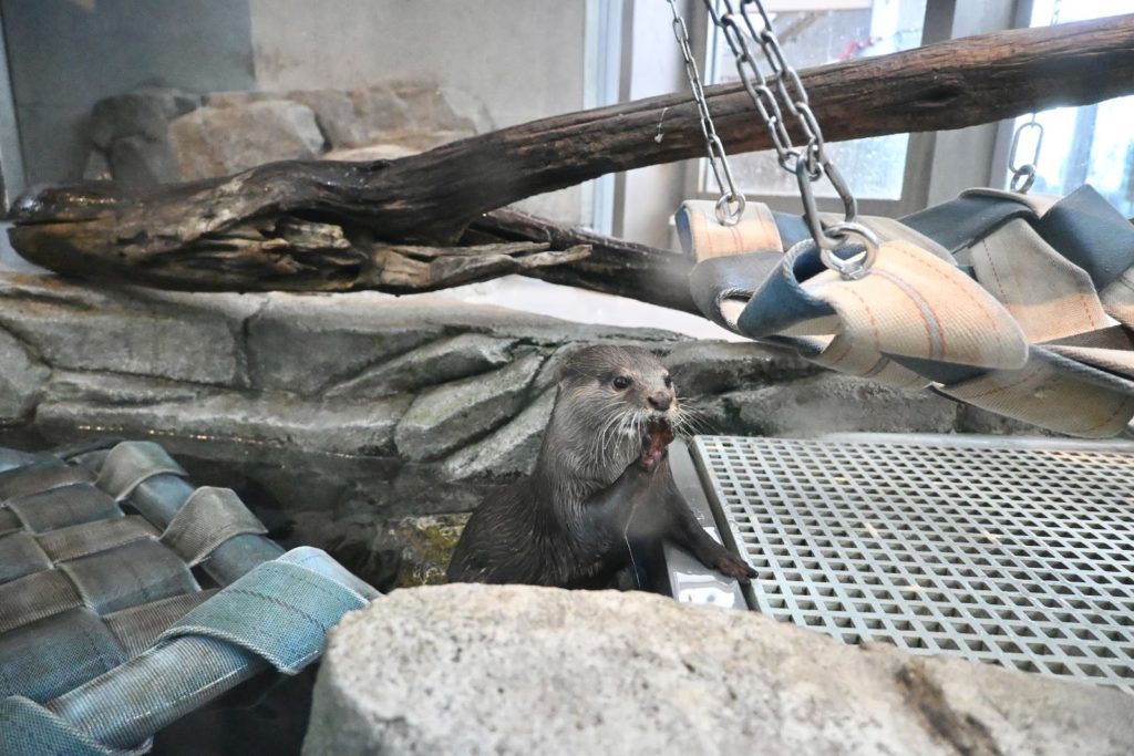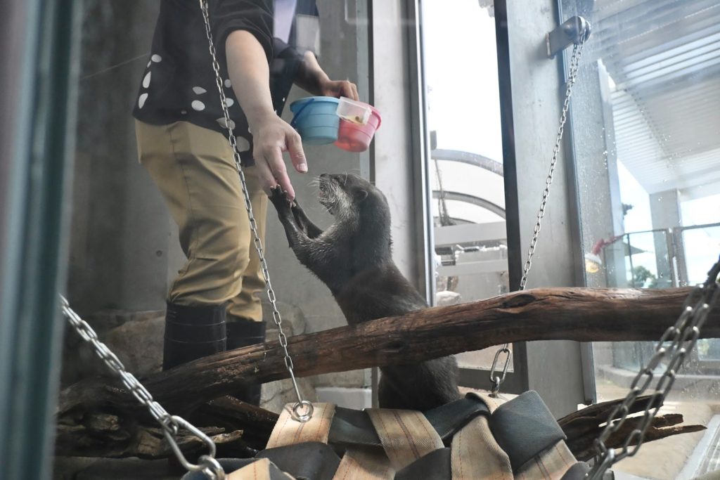 カワウソは1回目の餌やりが終わるといったん奥の別室に連れて行かれて展示エリアのお掃除が始まってしまうのですが、10分ほど待つとまた戻ってきて、2回目の餌やりタイムが始まりました。ご飯を楽しむカワウソさんを間近で堪能できるので、時間に余裕のある方はぜひお掃除が終わるのを待ってみてください!