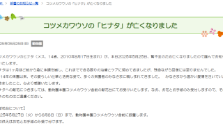 ニュース【悲しいお知らせ】鳥羽水族館のコツメカワウソ「ユウコ」が亡くなりました 鳥羽水族館のコツメカワウソ「ユウコ」が、2025年6月6日、亡くなったそうですユウコのご冥福を心よりお祈りします参照:お知らせ(鳥羽水族館 飼育日記) 2025.06.08ニュース